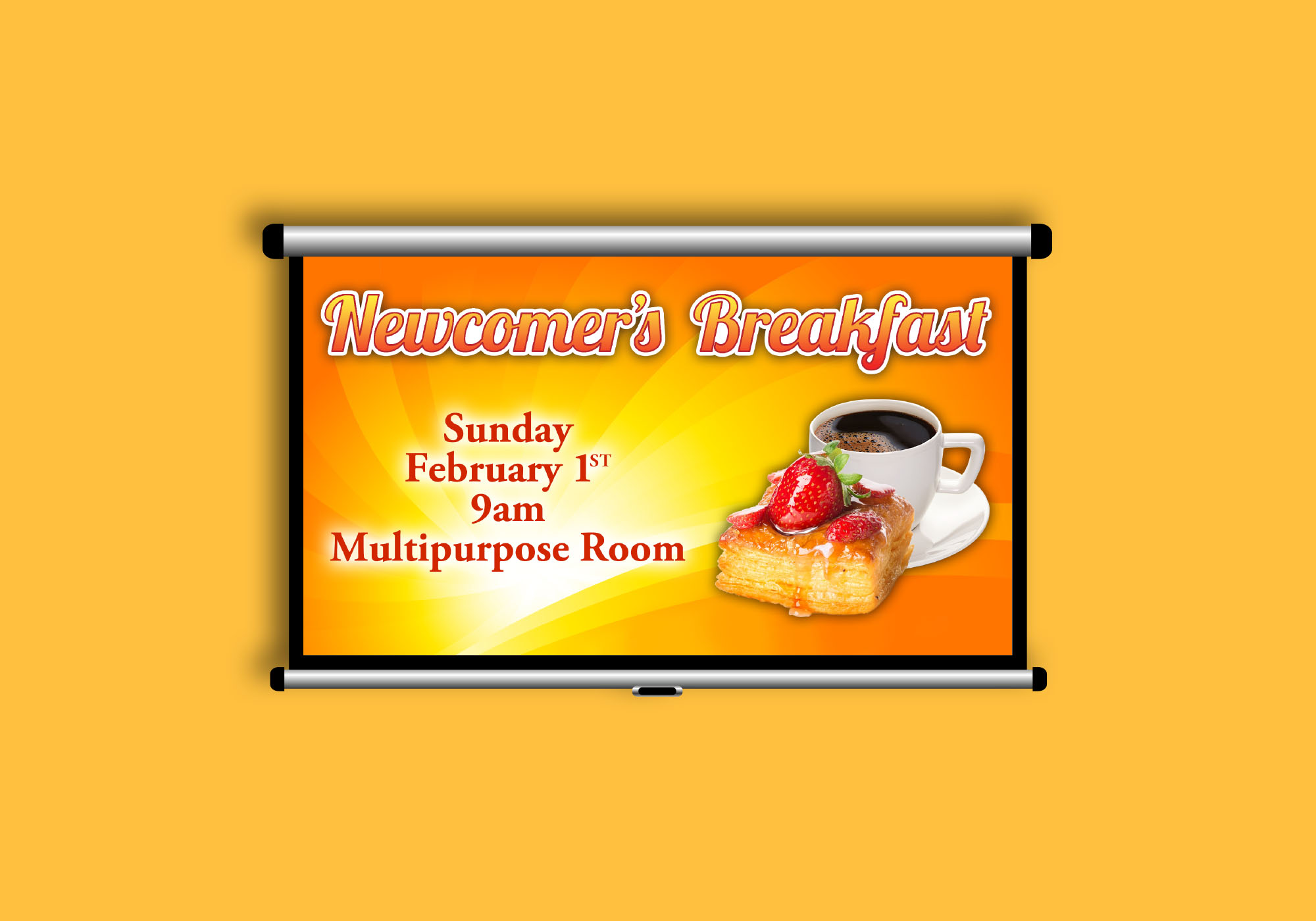 The newcomers breakfast is an event held multiple times throughout the year in which those new to the church are invited to a breakfast and tour of the campus. In need of an update, I was asked to redesign the sermon slide. I used a background that resembled a sunrise and used appropriate colors to giving a ”morning” feel to it. A welcoming and inviting font is used for the title.
